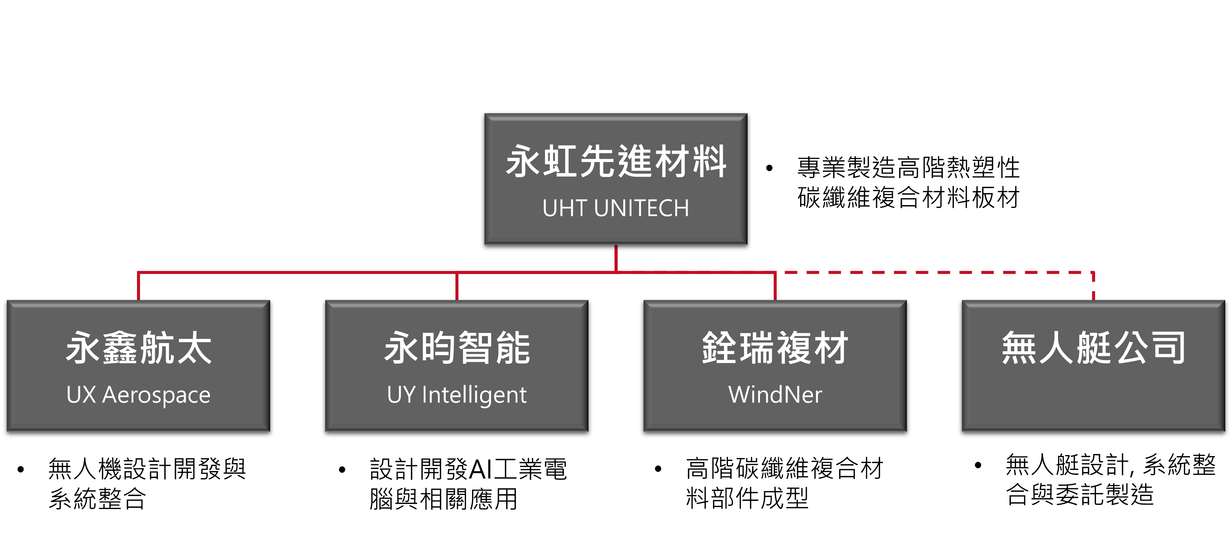 成立於 2011 年,總部位於台灣。UHT 憑藉十餘年碳纖維技術累積,於 2021 年戰略轉型,專注航太級熱塑性碳纖維複合材料的研發與量產。我們在南投草屯建立先進基地,提供從材料開發到量產的關鍵技術,是全球高階複材供應鏈的重要夥伴。